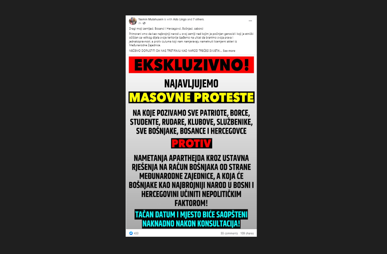 Danas je na Facebook profilu Jasmina Mulahusića pod imenom Yasmin Mulahusein objavljena najava masovnih protesta i poziv "patriotama, borcima, srudentima, rudarima, Bošnjacima, Bosancima i Hercegovcima"...